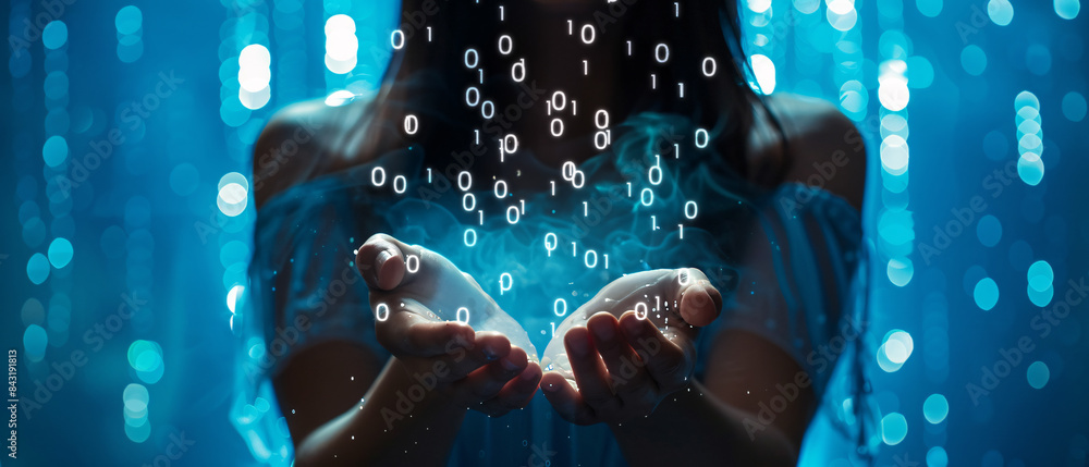 Wall mural hand of a woman in a cyberspace environment surrounded by binary code in her hand - concept of the f - Wall murals Wall mural hand of a woman in a cyberspace environment surrounded by binary code in her hand - concept of the f - Wall murals