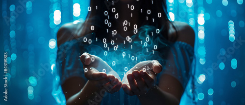 The watermark will not be included on Wall mural.: Hand of a woman in a cyberspace environment surrounded by binary code in her hand - concept of the f
