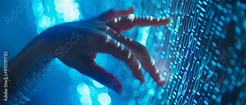 Wall mural hand of a woman in a cyberspace environment surrounded by binary code in her hand - concept of the f
