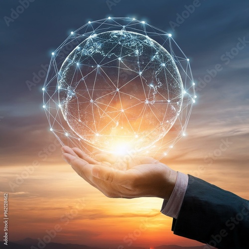 Wall mural hand of businessman connecting with global network circle against sunset sky - business networking,