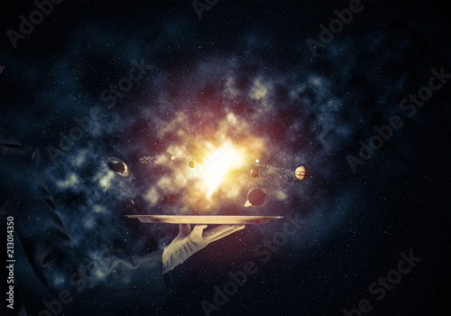 The watermark will not be included on Wall mural.: Hand of waitress presenting solar system on tray -