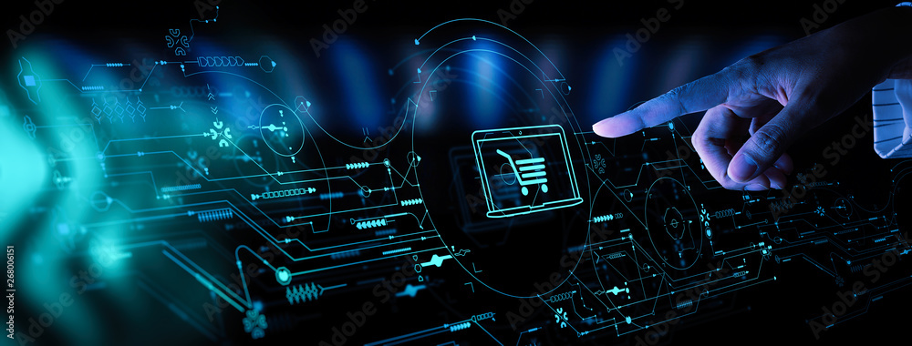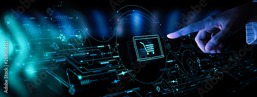 Wall mural : Hand pushing virtual symbol of online shopping with modern ui computer and smart phone -
