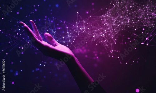 Wall mural hand reaching towards abstract digital network symbolizing technology and business growth with purpl - Wall murals Wall mural hand reaching towards abstract digital network symbolizing technology and business growth with purpl - Wall murals