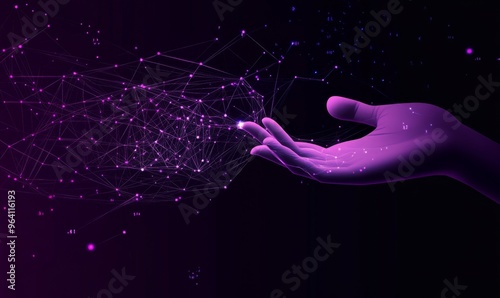 Wall mural hand reaching towards abstract digital network symbolizing technology and business growth with purpl - Wall murals Wall mural hand reaching towards abstract digital network symbolizing technology and business growth with purpl - Wall murals