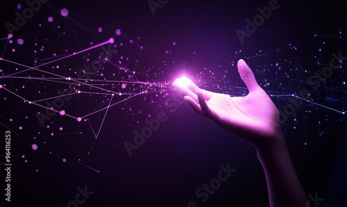 Wall mural hand reaching towards abstract digital network symbolizing technology and business growth with purpl - Wall murals Wall mural hand reaching towards abstract digital network symbolizing technology and business growth with purpl - Wall murals