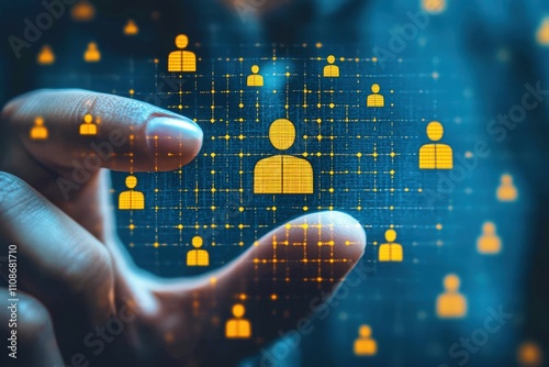 Wall mural : Hand reaching towards digital network with human icons representing connection and communication in