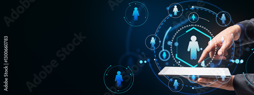 The watermark will not be included on Wall mural.: Hand selecting icon on tablet with network of people in background -