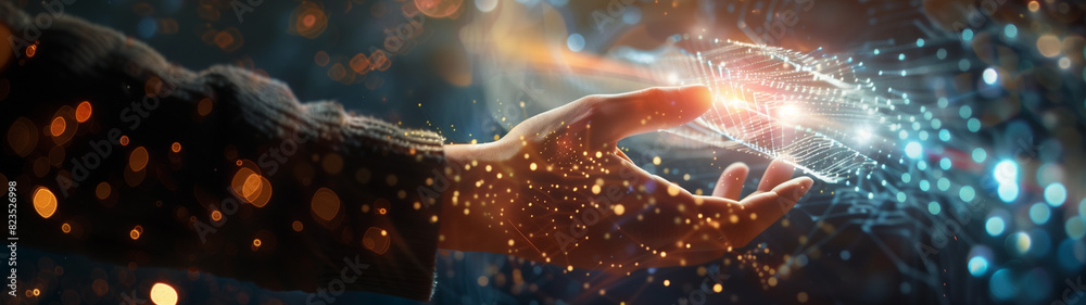 Wall mural hand touching a flowing data set, concept for coding, created with generative ai technology - Wall murals Wall mural hand touching a flowing data set, concept for coding, created with generative ai technology - Wall murals