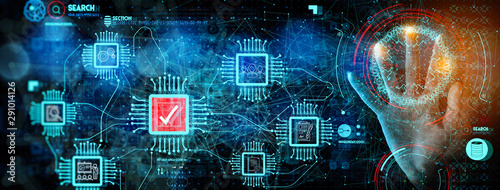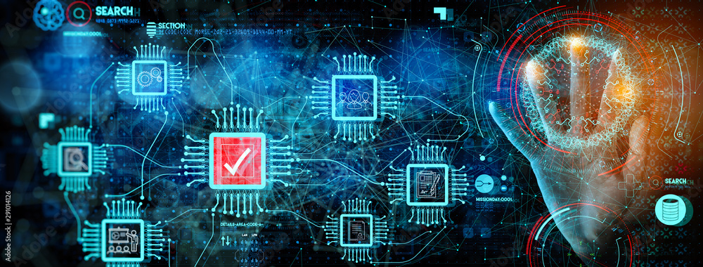 Wall mural hand touching with data management system (dms) and business analytics concept with servers connecte - Wall murals Wall mural hand touching with data management system (dms) and business analytics concept with servers connecte - Wall murals