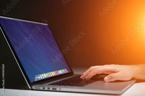 Wall mural : Hand typing on a keyboard of laptop with operating system screen on background