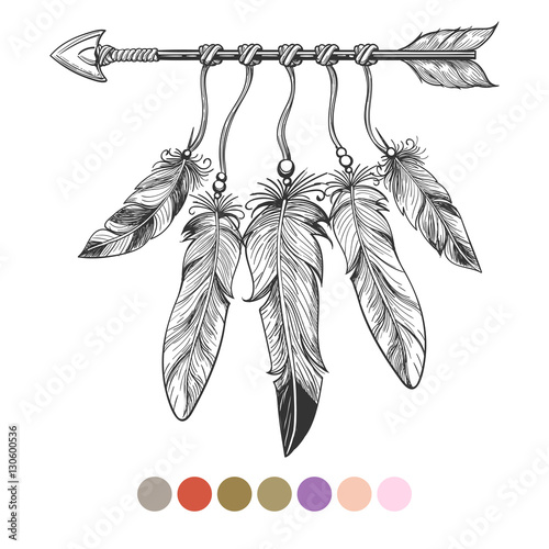 The watermark will not be included on Wall mural.: Handdrawn colorng boho element - arrow and feathers on white background with color swatches - vector i