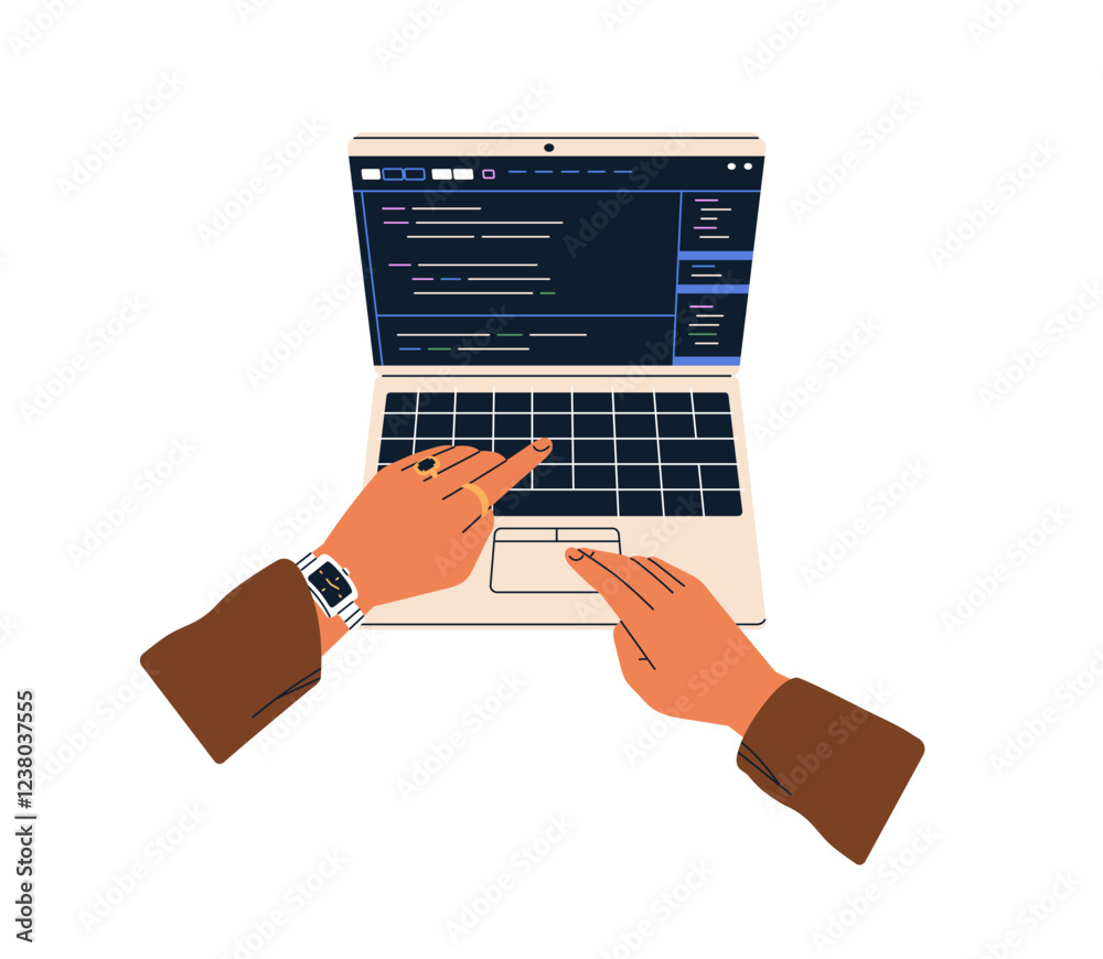 The watermark will not be included on Wall mural.: Hands at laptop keyboard during online work - computer screen with abstract web-site interface - brows