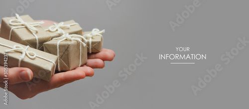 Wall mural : Hands hold set of gift boxes - delivery service - gray background - gift exchange - web article template