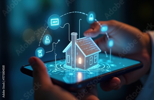 Wall mural hands hold smartphone displaying smart home app. 3d house icon appears on screen. app manages home s - Wall murals Wall mural hands hold smartphone displaying smart home app. 3d house icon appears on screen. app manages home s - Wall murals