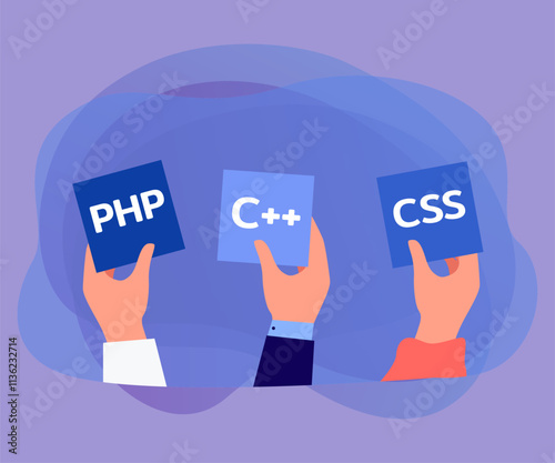 The watermark will not be included on Wall mural.: Hands holding symbols of different programming languages - programmers using software for coding flat
