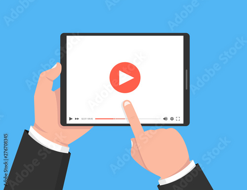 Hands holding tablet and touching screen - video player on screen - vector illustration - Wall mural