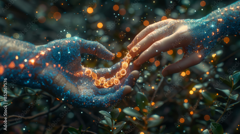 The watermark will not be included on Wall mural.: Hands of robot and human touching on dna connecting in virtual interface on future, science and inno