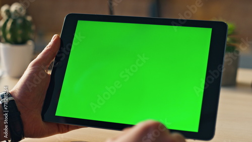 The watermark will not be included on Wall mural.: Hands touching mockup tablet searching information in internet indoors close up -