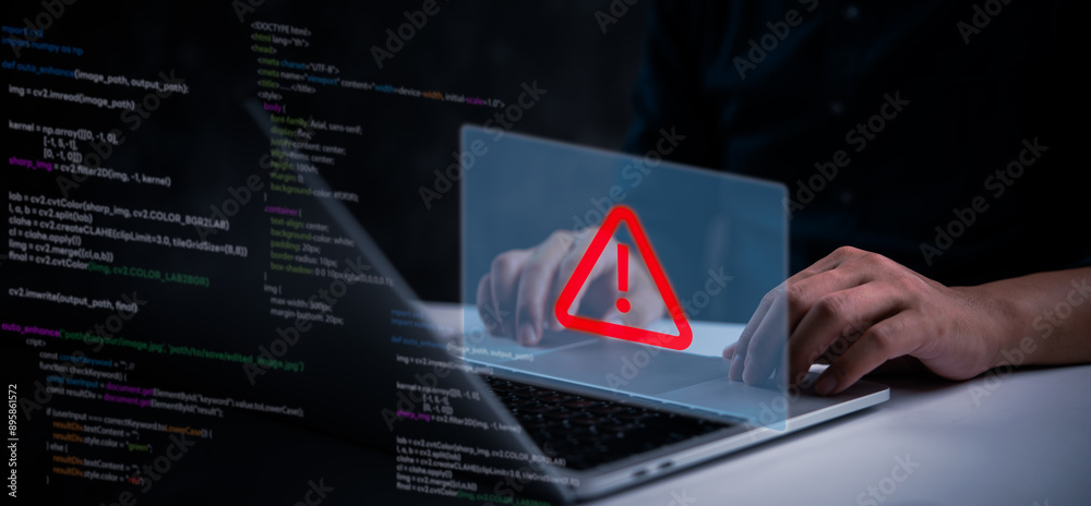 Wall mural : Hands typing on a laptop keyboard with a red warning symbol displayed on a virtual interface, indica