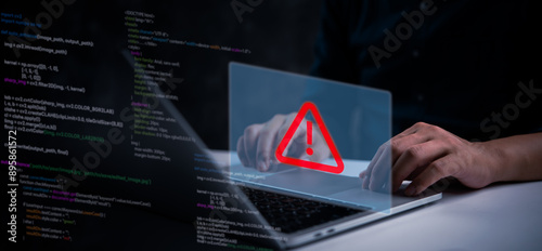 The watermark will not be included on Wall mural.: Hands typing on a laptop keyboard with a red warning symbol displayed on a virtual interface, indica