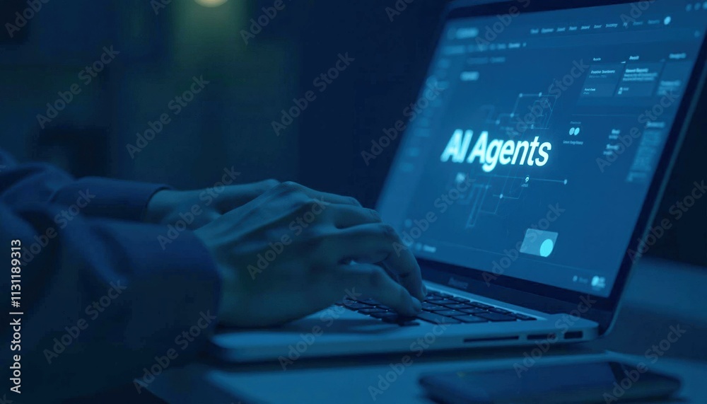The watermark will not be included on Wall mural.: Hands using laptop with ai agents screen in blue tones, focused digital work, machine learning, arti