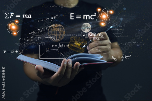 Hands writing in notebooks on dark the background physics and math equations floating on the backgroWall mural