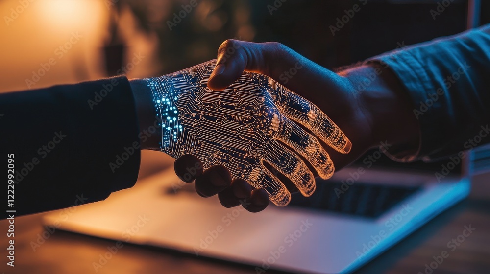 Wall mural : Handshake between a human and a robotic hand symbolizing collaboration in technology - digital transf