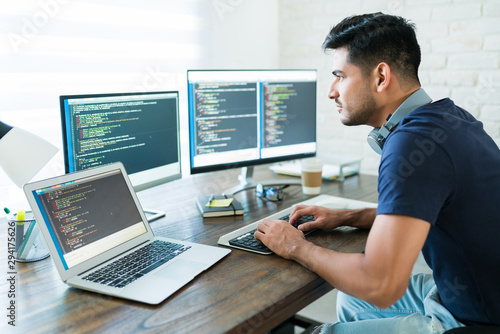 The watermark will not be included on Wall mural.: Handsome young male programmer coding at desk