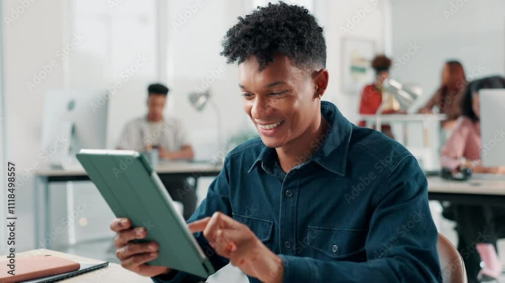 Happy, coworking and man with tablet, research and excited for programming tutorial, online and digiWall mural