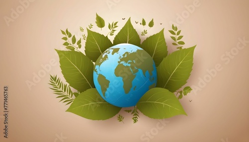 Wall mural happy earth day. ecology concept. design with globe map drawing and leaves on light brown background