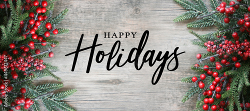 Happy holidays text with holiday evergreen branches and red berries frame on sides over rustic woodeWall mural