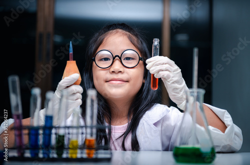 The watermark will not be included on Wall mural.: Happy little scientist in lab coat making experiment with test tube