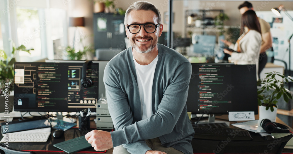 The watermark will not be included on Wall mural.: Happy man, coder and glasses in office for portrait, website development and software engineering on