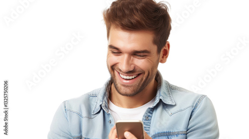 Happy man smiling and using smartphone on transparent backgroundWall mural