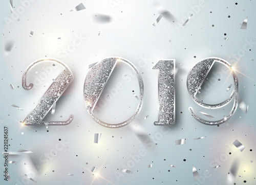 Wall mural happy new year 2019 greeting card with silver numbers and confetti frame on white background. vector