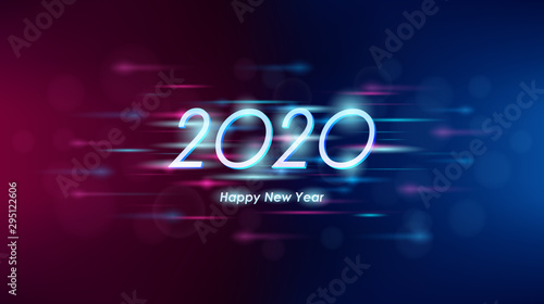 Wall mural happy new year 2020 in abstract technology lines and glitter on red and blue color background