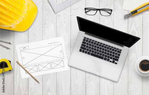 Wall mural : Hard work on designing a new website - top view of table with laptop and sketched layout of the new w