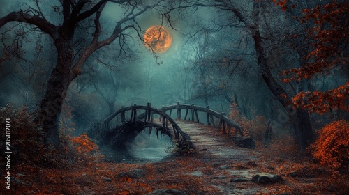 The watermark will not be included on Wall mural.: Haunted autumn forest with lifeless trees and an ancient wooden bridge under a full moon
