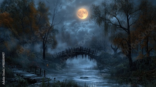 The watermark will not be included on Wall mural.: Haunted autumn forest with lifeless trees and an ancient wooden bridge under a full moon