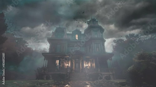 The watermark will not be included on Wall mural.: Haunted house and cloudy weather with lightning - seamless looping time-lapse virtual video animatio
