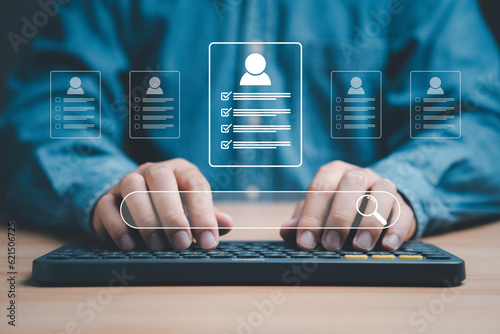 The watermark will not be included on Wall mural.: Headhunter using computer to check and select the optimum resume application form , human developmen