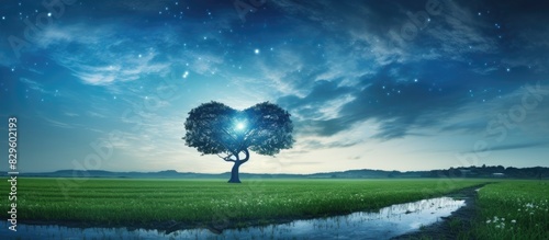The watermark will not be included on Wall mural.: Heart shaped tree in a paddy field with milky way backdrop in a rural setting perfect for a copy spa