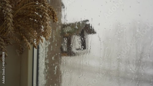 Wall mural heavy snowfall behind the window. slow motion. raindrops running down a window.