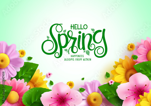 Wall mural hello spring text vector background design. spring hello greeting typography with blooming fresh flo