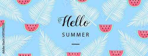 The watermark will not be included on Wall mural.: Hello summer banner - flat style summer background - trendy summer wallpaper with fruit - vector