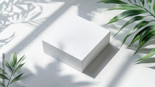 Wall mural : High angle studio shot of a 3d box mockup with soft natural light and a white background creating a