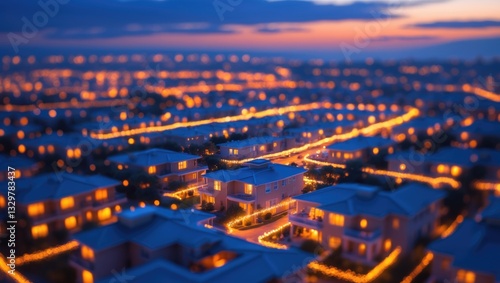 Wall mural : High-angle view capturing the hidden glow of evening lights, creating a soft blur of nighttime illum