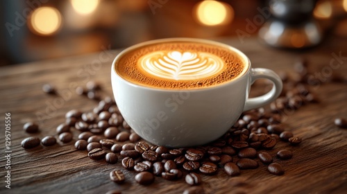 Wall mural : High-quality close-up of a beautifully crafted latte resting on roasted coffee beans in a cozy cafe
