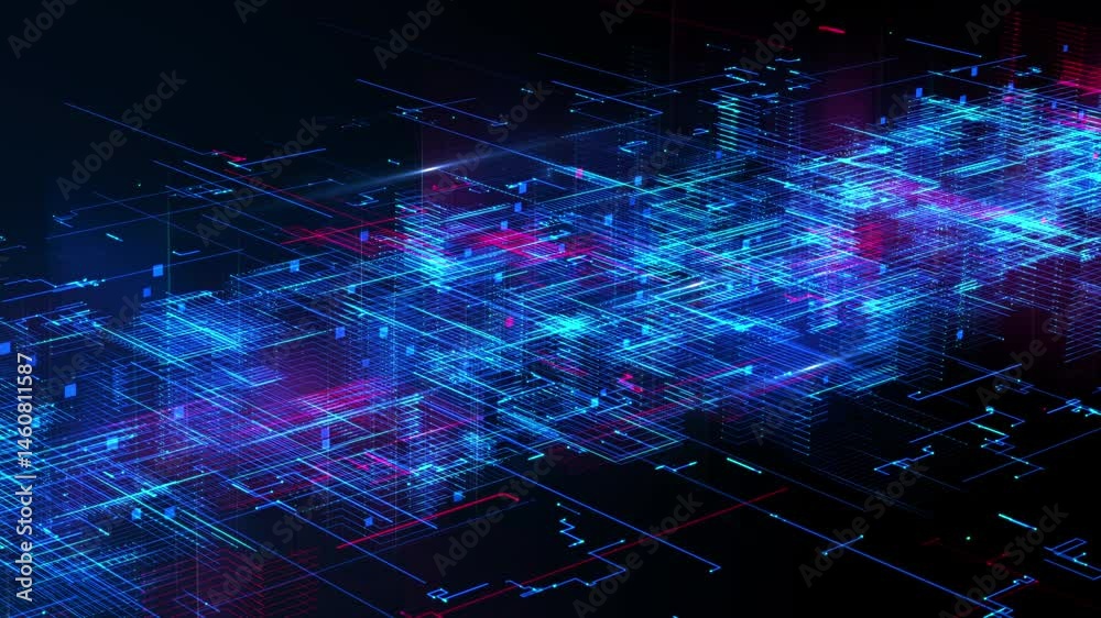 Wall mural high-tech abstract network background with glowing blue and red data lines and grid structures, idea