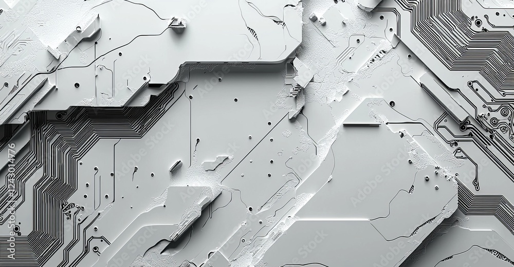 The watermark will not be included on Wall mural.: High-tech circuit board connection system displayed as a black circuit diagram on a white background
